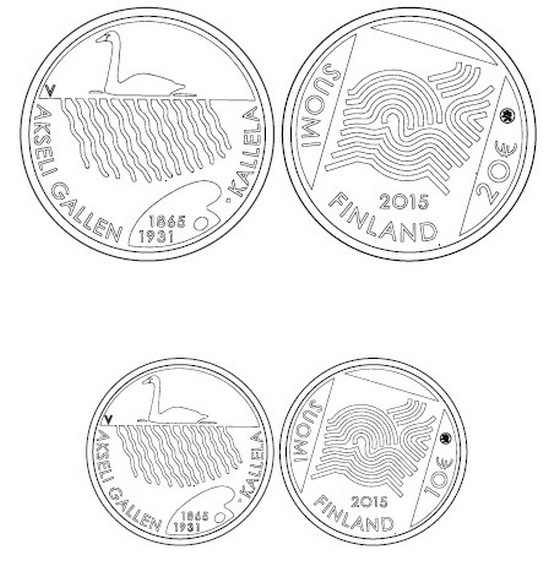 En plus de la 2 €, la Finlande émettra en 2015 des pièces de 10 € et 20 € dédiées au 150ème Anniversaire de la Naissance du Peintre Akseli Gallen-Kallela.
