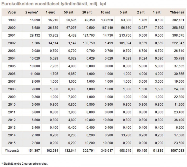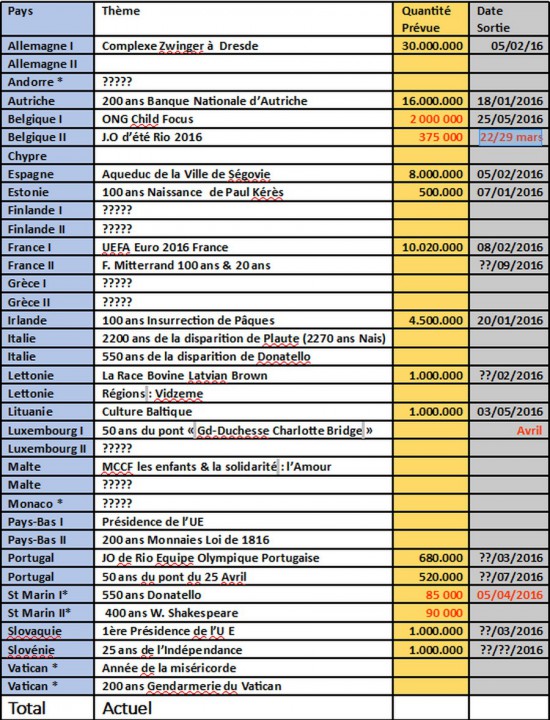 Un petit tableau récapitulatif des 2 € prévues pour 2016 avec tirages et dates de sortie.