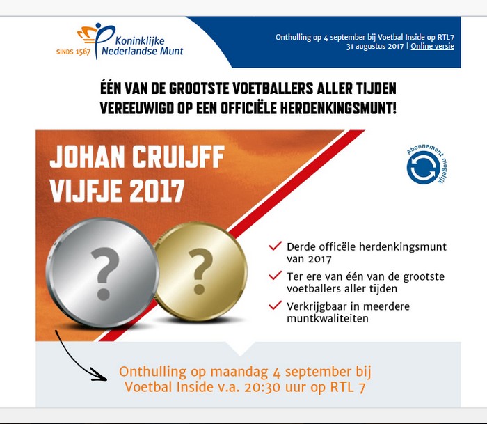 Deux pièces seront émises en 2017 pour honorer le joueur Johan Cruijff.