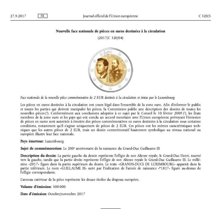 Sortie au JO de la 2 € dédiée au 200ème anniversaire de la naissance du grand duc Guillaume III.