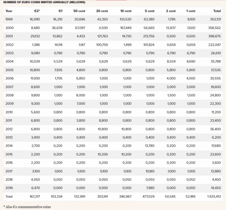 Les chiffres officiels d'émission pour les 2 €, les BE et les pièces UNC de 1999 à 2019 sont sur le forum.
