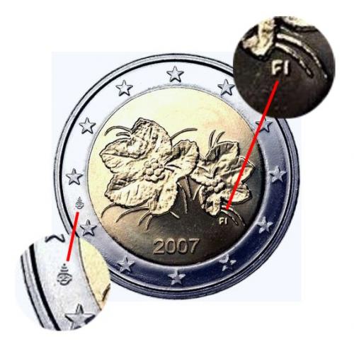- 1 a 50 cent : o leão heráldico ilustra o orgulho da independência conquistada A partir de 2007, a Finlândia alterou as suas faces nacionais para respeitar as recomendações do Jornal Oficial da commissão Europeia n°2009/23/CE que diz que deve encontrar-se nas moedas uma identificação clara do país (quer seja o nome completo ou só as letras iniciais). A Finlândia optou por acrescentar as iniciais FI, e também aproveitou para colocar o símbolo da Rahapaja Oy (). Aproveitou ainda a oportunidade para passar para a nova face comum, prevista só para 2008. Estranhamente, a letra M do mestre Raimo Makkonen, sob o punho da espada, desapareceu. Pequena anedota, o símbolo da Rahapaja Oy presente entre as estrelas das 8h e das 9h em 2007, foi movido sob o punha da espada a partir de 2008.