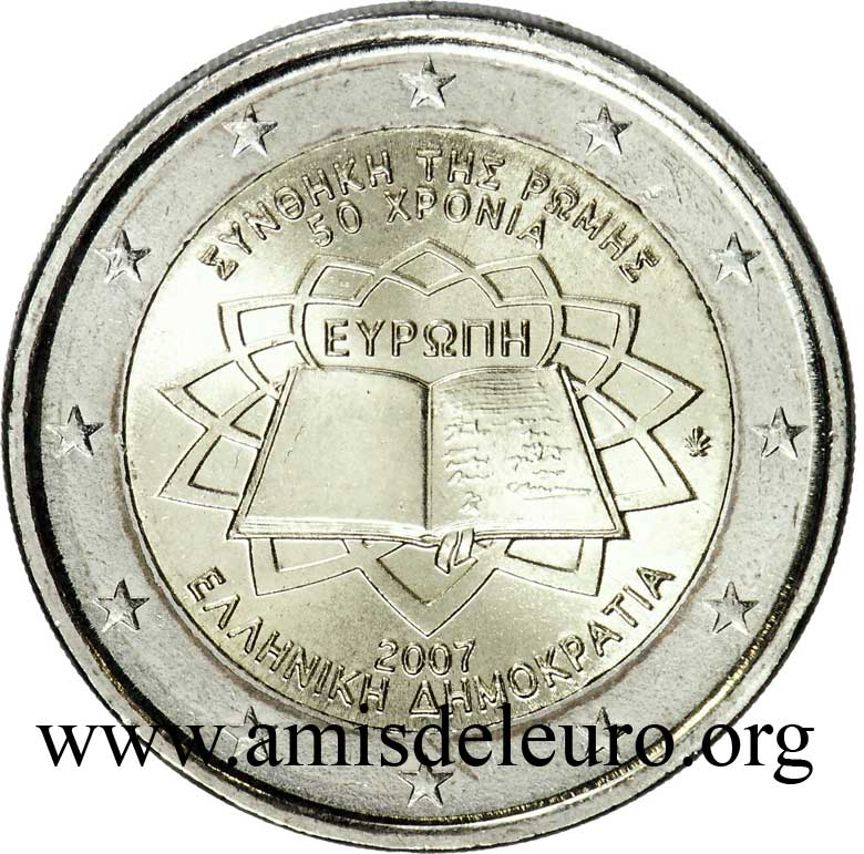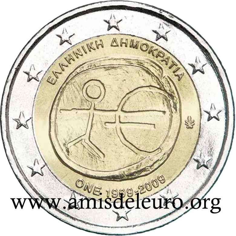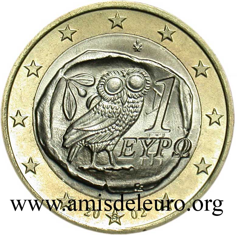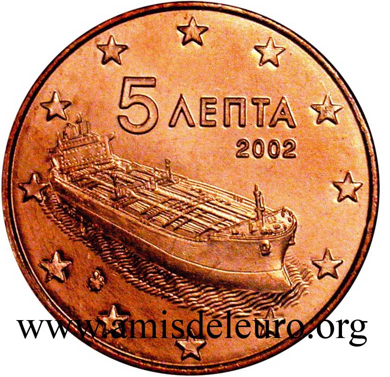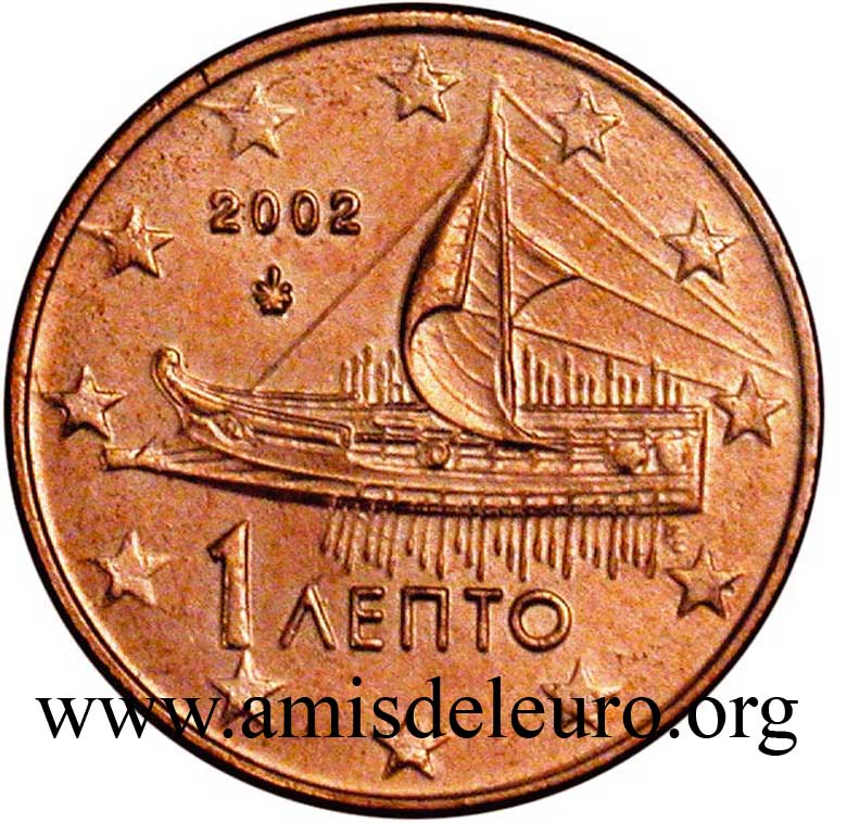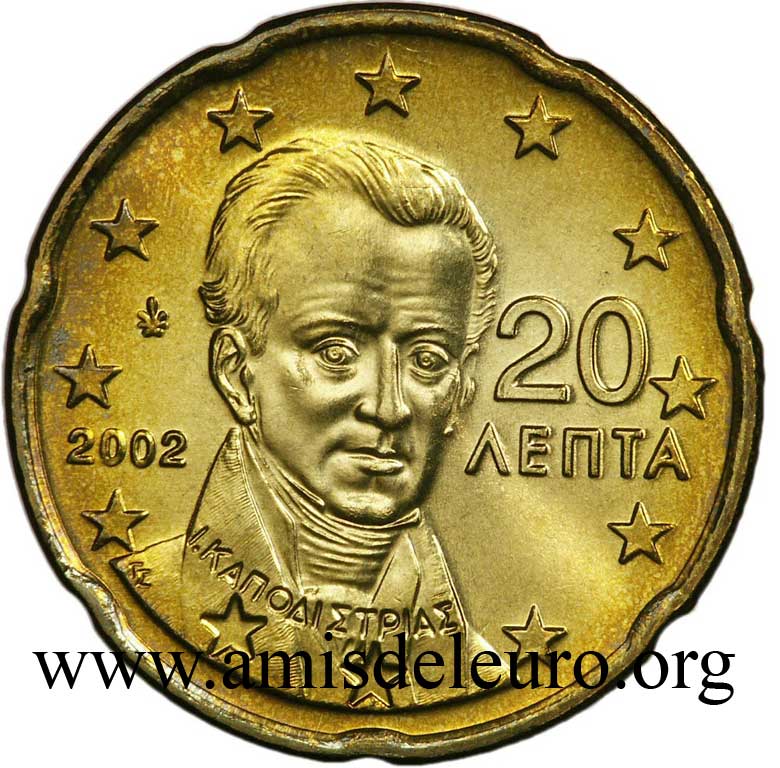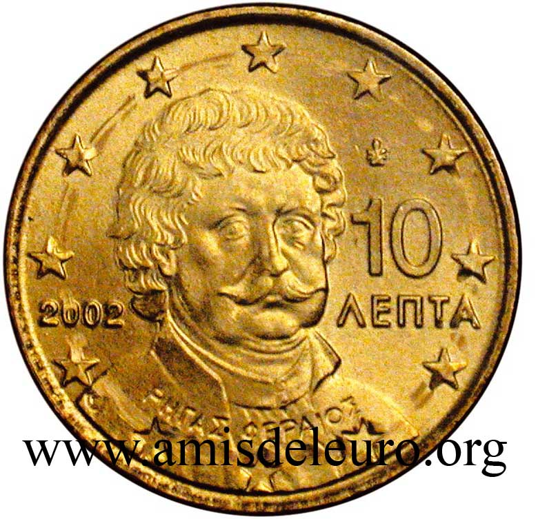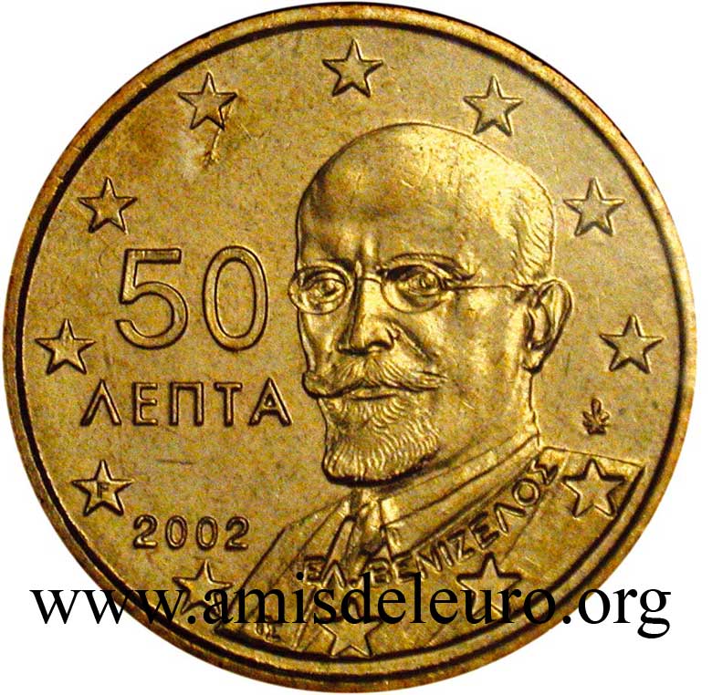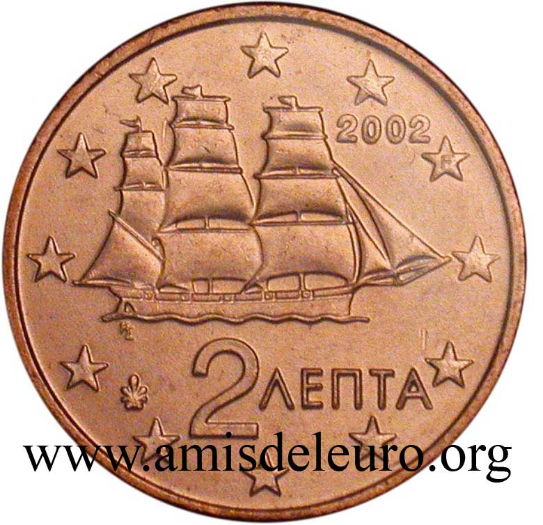 A Grécia e o Euro Candidata desde o primeiro dia ao euro, a Grécia será o único país com a Suécia que não conseguiu qualificar-se em 1999. Muitos esforços, muitas "trapaças" (mas outros fizeram o mesmo) conduzirão a adiar a qualificação, apenas, por um ano (Janeiro 2000), permitindo, no entanto , uma introdução comum com os outros 11 membros, no dia 1 de Janeiro de 2002. A Grécia tendo aderido tardiamente ao euro, teve que pedir ajuda aos ateliers estrangeiros para respeitar o prazo de 1 de Janeiro 2002. Para isto, ela se virou para 3 ateliers, a França para as moedas de 1, 2, 5, 10 e 50 cent, a Epanha para as moedas de 20 cent e a Finlândia para as moedas de 1 e 2 euro. Os três países não foram autorizados a incluir suas próprias marcas, mas poderam utilizar uma letra minúscula nas estrelas próximas do milésimo 2002. Para França, como de costume, a letra F, para Espanha a letra E, para a Finlândia a letra S (por Suomi que significa Finlândia em finlandês). Estas moedas, mais raras que as fabricadas pela Grécia, são também encontradas nos starter kits, são procuradas quando estão em bom estado ! O Banco de Grécia marca suas moedas duma folha vertical mesmo quando não é ele a cunha-las. De facto, mesmo nas moedas cunhadas com um F, encontra-se a sua marca, enquanto que, para as moedas cunhadas pela França, deveríamos encontrar a cornucópia e a marca monetária do Gravador Geral de París, como foi o caso na 20 dracmas de ouro da última união monetária europeia, antes do Euro. Passa-se o mesmo para as moedas cunhadas pela Espanha e pela Finlândia. Os gravadores assinam suas obras. O nome do país não aparece nas moedas gregas do euro em circulação, só no bordo da 2 euro. A Grécia, como a Áustria colocou o valor facial da moeda na face nacional sabendo que é proibido pelas recomendações do l'artigo 2 do Jornal Oficial da commissão Europeia n°2009/23/CE, mas a Grécia benificiou de uma derrogação por causa do seu alfabeto atípico. As moedas gregas são todas diferentes : As pequenas moedas evocam a vocação marítima da Grécia. - 1 cent : a trirreme antiga - 2 cent : a corveta do tempo da independência - 5 cent : o petroleiro As moedas amarelas têm, sem dúvida, menos sentido fora da Grécia, pois, elas se relacionam diretamente com a história da indepedência, restaurada em 1830 : - 10 cent : Rigas Velestinlis-Ferreos (1757-98), grande figura do renascimento grego, martirizado - 20 cent : Capodistrias (1776-1831), o primeiro presidente após a independência em 1830, assassinado no ano seguinte - 50 cent : Venizelos (1864-1936), o mais famoso, que introduziu a modernidade na Grécia (ver acima)