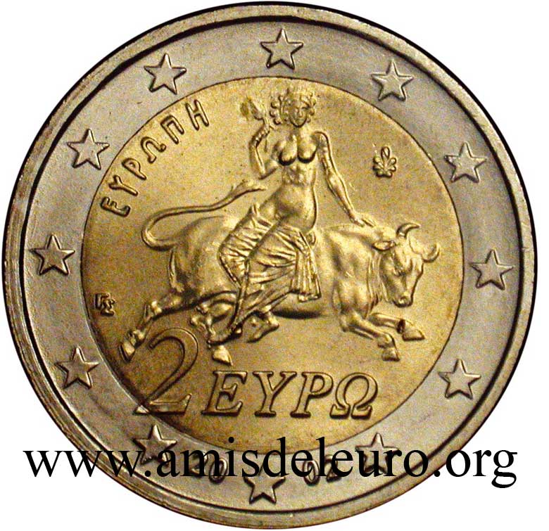 finalmente, as bimetálicas: - 1 euro : a coruja, emblema de Atenas e portanto dos Atenienses, é também um dos pilares fundamentais da Europa, o da democracia. - 2 euro : o rapto de Europa, isto nos faz lembrar a origem da nossa união