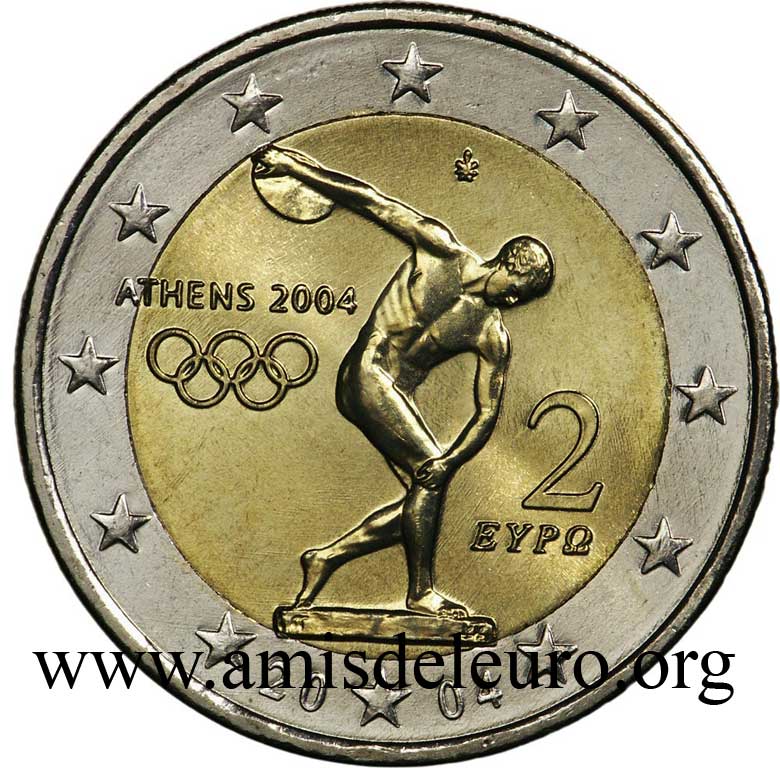 Gramática as palavras "euro" e "cent" são invariáveis, na Europa, nas moedas e nas notas, e a Grécia teve necessidade de ajustar as palavras ΛEΠTO (lepto = cêntimo) sobre a moeda de de 1 cent, ΛEΠTA (lepta = cêntimos, o plural de lepto) sobre as moedas de 2 a 50 cent, e EYPΩ (evro = euro) para as bimetálicas. As 2 euro comemorativas Em 2004, a Grécia é o primeiro país a emitir uma 2 euro comemorativa, na altura dos JO de Atenas. Dado o atraso na publicação, o Luxemburgo não ficou em primeiro lugar ! Deve-se notar que para esta primeira comemorativa, foi redigida uma derrogação. Na verdade, estava previsto pelo departamento que as moedas comemorativas não podiam ser postas em circulação antes de 2008. O motivo era que deviamos dar tempo às pessoas da zona Euro para se acostumarem com as faces dos diferentes países. Mas a moeda europeia foi rapidamente adoptada e o tema dos JO era honroso para uma primeira comemorativa. Após esta primeira comemorativa, a Grécia manteve-se calma, foi preciso esperar pela 2 euro comum do Tratado de Roma, em 2007, para ver a segunda. A grécia tem por hábito de não cunhar a de 2 euro normal quando propoê a 2 euro comemorativa, então o único meio de obtê-los é comprar as caixas BU, cuja cotação sobe rapidamente. A Grécia tem emitido muitas comemorativas não circulantes e carteiras UNC , algumas das quais contêm medalhas. A letra país das notas gregas é o Y, conforme a regra de atribuição, para ter uma letra maiúscula do seu próprio alfabeto. Encontra-se o Y da Grécia sobre as notas 5, 10, 20, 50, 100, 200 e 500 euro e para as duas assinaturas, Wim Duisenberg e Jean-Claude Trichet. Para a parte da produção que é responsável, a Grécia mandou imprimir ao impressor Grego (N), ao impressor Alemão (P), ao impressor Austriaco (F), ao impressor Holandês (G), e ao impressor Alemão (R).